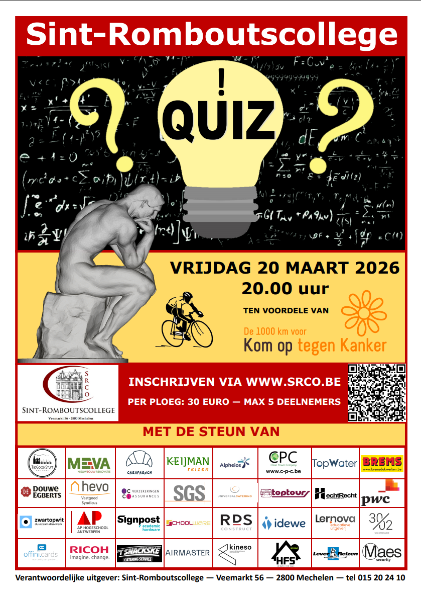 Op vrijdag 20 maart 2026 organiseert het Sint-Romboutscollege een quiz ten voordele van Kom op tegen Kanker om 20u00. Inschrijven kan via de volgende link: klik hier.